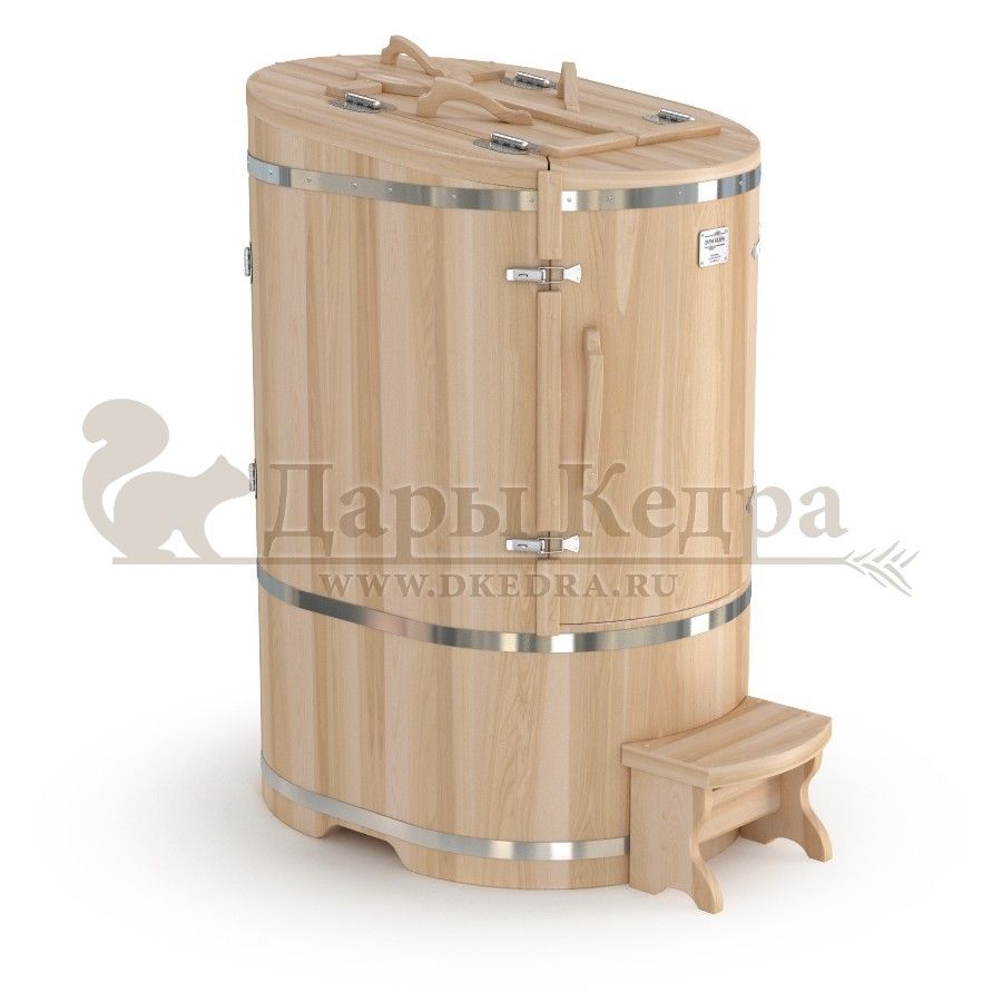 Кедровая бочка (фитобочка) овальная со встроенным парогенератором «Профессиональная» Овальная форма этой кедровой бочки позволяет комфортно разместится даже высоким людям. Встроенный парогенератор исключает дополнительный монтаж. Ширина 78 мм позволяет занести бочку в помещение со стандартным проёмом в собранном виде. Толщина стенок 45 мм позволяет увеличить срок службы изделия. Подходит для коммерческого использования.