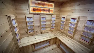 Это специально оборудованная кедровая кабина для прогрева тела человека сухим теплом. Воздух в таких парных не нагревается. Инфракрасные лучи воздействуют на тело, равномерно прогревая мышцы, суставы и органы. Керамические излучатели похожи на лампы, имеют высокую температуру нагрева, поэтому защищены противоожоговыми решетками. Тело человека в таких саунах нагревается интенсивнее. Работает кабина за счет электричества. Трехместная инфракрасная сауна с керамическими излучателями подойдет как для домашнего использования, так и для коммерции.