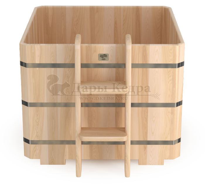 Это квадратная емкость для воды из кедра. Она предназначена для отдыха и охлаждения тела после банных процедур. Благодаря своей форме купель хорошо впишется в угол помещения, так же ее можно установить на улице. Квадратная купель оснащена лавочками, приставной и внутренней лестницей из кедра. За счет стяжных болтов обручи из нержавеющей стали плотно прилегают к кедровой купели. Это позволяет равномерно распределять нагрузку воды и сохранить форму изделия в период эксплуатации. При правильном уходе купель для бани не рассыхается и не подвергается гниению.